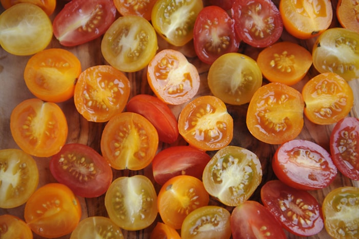 3- To cut cherry tomatoes in half, put them between two plates and slide your knife through the crack between the plates.