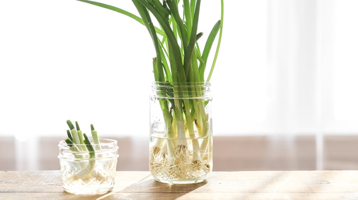 10- To have an endless supply of green onions, drop the white leftover roots in a glass of water and they’ll grow back on their own in a few days!