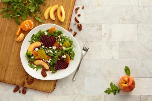 Finally, in the 5-quart Mixing Bowl, combine arugula, crumbled goat cheese, mandarin wedges, peach slices, pecans, the and chilled beets. Pour the dressing over the salad. Mix and enjoy!
