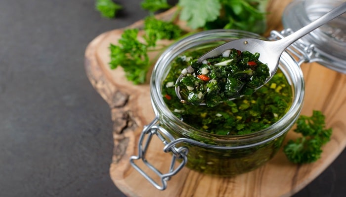 This hearty green sauce is what you’ll find on most grilled meats in Argentina and Uruguay. It is traditionally made with finely chopped parsley, garlic, olive oil, salt, white vinegar, and fresh oregano, but can take on other ingredients, herbs, and spices depending on who you’re asking and what you’re putting it on.