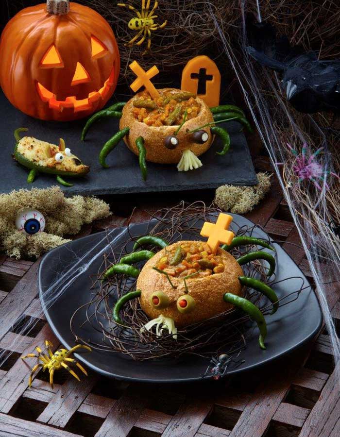 To serve the chili, take a bread roll, scoop out the soft insides and use it as a bowl. You can even use food coloring to paint the bowl orange so that it looks like a pumpkin.