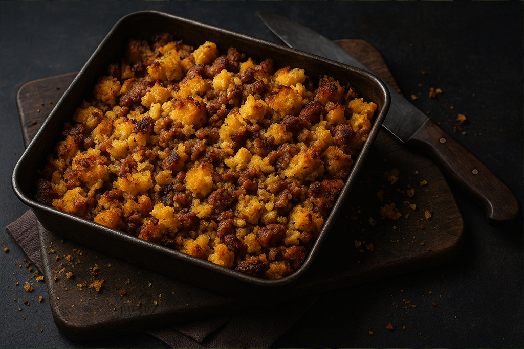 There you have it: our feisty, flavor-packed chorizo and cornbread stuffing. It’s an ideal side dish—or stuffing for the holiday turkey—that brings together tastes in one harmonious forkful. With the smokiness of chorizo, the sweet cornbread base, and that fresh zing of sage and cilantro, you’re giving your guests something to talk about (and come back for seconds). We’re not just expanding horizons here; we’re stretching the stuffing game into bold new territory. So gather your people, pop this in the oven, and get ready for the compliments (and maybe a few “who made this?!” questions). Give thanks, dig in, and yes—you’ll want to save this recipe.