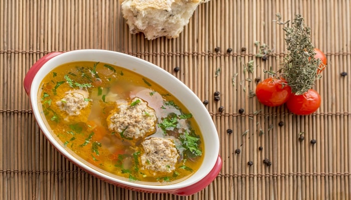 Heat up the broth in a stock pot and bring to a simmer. Carefully drop the meatballs in the hot liquid and cook for around 30-45 minutes, depending on the size of the balls. Ladle into bowls and serve with a warm flour tortilla.