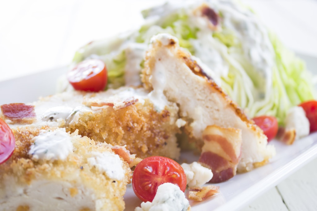 This hearty salad starts with the chicken, and ends with a Latin American favorite that spices everything up. Chicken breasts are battered, pan fried, then cut into thin slices and set aside in the fridge to chill. The salad itself is fairly simple to assemble, containing cherry tomatoes, mixed greens, avocado, cotija cheese and sliced jalapeño peppers.
