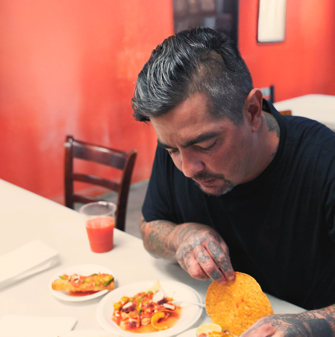 Mariscos Jalisco, a food truck born in 2002, brings the taste of Jalisco to Boyle Heights streets. From tacos de camarón to the creative Taco Tritón and Taco Poseidón, the truck proves that gourmet-quality seafood doesn’t need a white tablecloth. Aarón also savors the tostada de ceviche and fresh oysters, highlighting how street food can be both casual and beautifully plated.